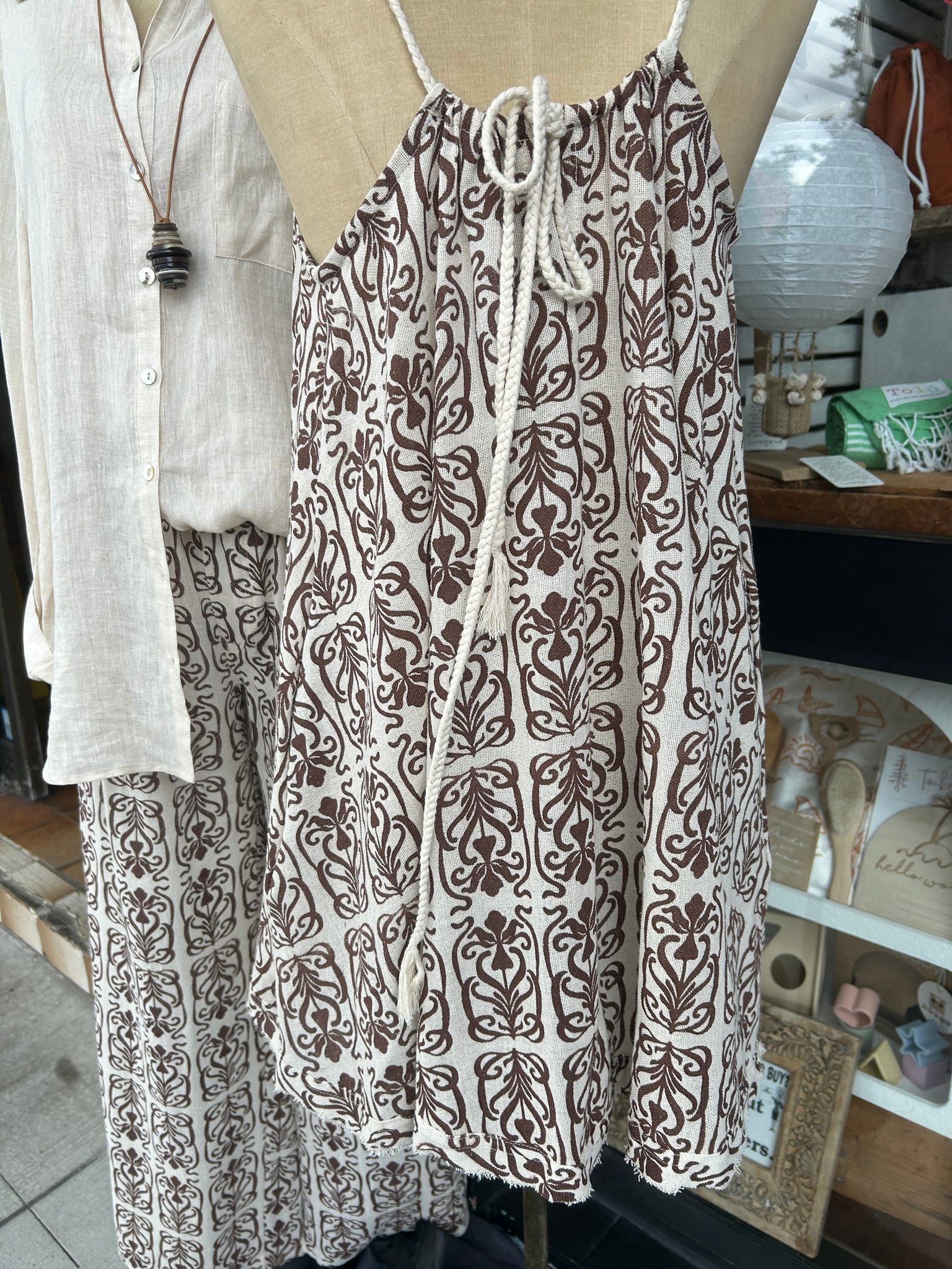 Elevate your warm-weather wardrobe with this effortlessly chic halter neck dress. Made from 100% raw cotton, it features a timeless brown and white floral scroll print and a relaxed A-line silhouette for a comfortable, flattering fit. Perfect for everything from casual days out to sunset dinners by the beach.