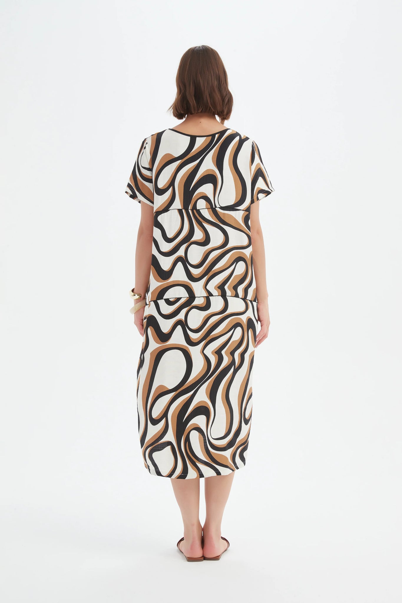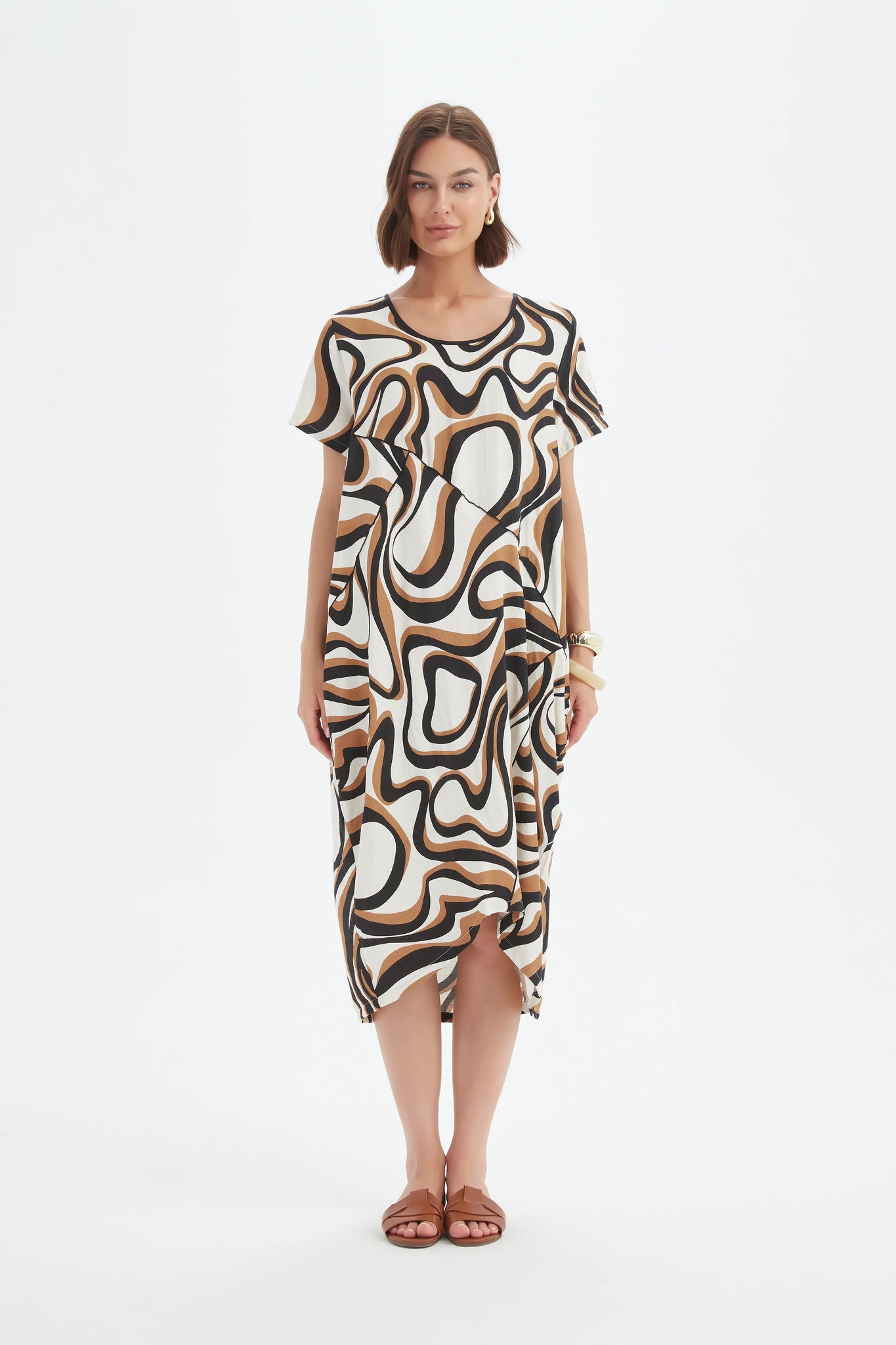 The Panel Print Dress is where artful design meets everyday ease. This midi features an asymmetric panel construction that creates shape and movement. Finished with short sleeves and practical pockets, it’s a modern piece that balances comfort with statement style. Effortless to wear and easy to style, it’s a dress you’ll reach for time and again.