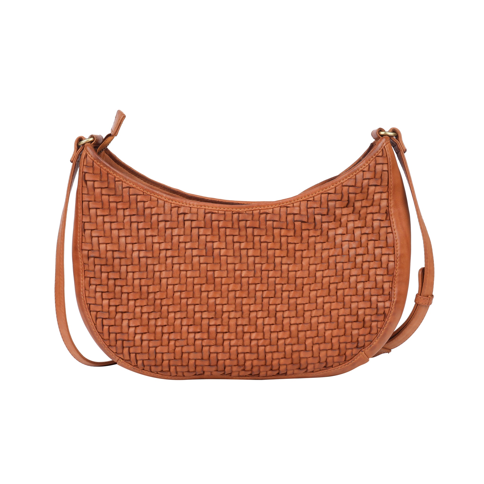 Ladies’ Leather Half-Moon Woven Crossbody Bag. Chic and functional, beautifully crafted, unique woven leather design. Main Compartment secured with a zip. Interior Storage includes a zip pocket and two slip pockets. Intricate weave design featured on both sides for added texture and style. The curved half-moon silhouette offers generous interior space and sits comfortably against the body. Long strap ensures a secure and customisable crossbody fit.